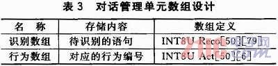 為了方便進(jìn)行對(duì)話的管理,本文中設(shè)計(jì)了一個(gè)對(duì)話管理單元,用于對(duì)等待識(shí)別的語(yǔ)句和等待執(zhí)行的命令進(jìn)行存儲(chǔ),在主控制器中通過(guò)定義二維數(shù)組來(lái)實(shí)現(xiàn)。LD3320每次識(shí)別最多可以設(shè)置50項(xiàng)候選識(shí)別句,每個(gè)識(shí)別句可以是單字、詞組或短句,長(zhǎng)度為不超過(guò)10個(gè)漢字或者79個(gè)字節(jié)的拼音串;谏鲜鲈,本文設(shè)計(jì)的對(duì)話管理數(shù)組如表3所列。