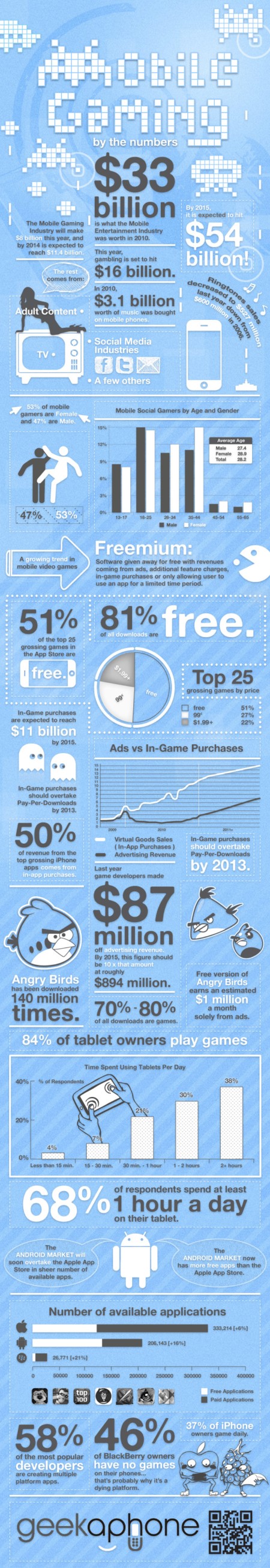 隨著移動互聯(lián)網浪潮的興起,大家玩游戲的平臺逐漸從傳統(tǒng)的游戲機,PC,TV向新興的智能手機和平板電腦等移動終端遷移。PC時代的游戲巨頭EA,育碧等公司的光芒不再,PopCap,Rovio和Zynga等新興游戲公司出品的游戲則吸引著越來越多的玩家。照目前強勁的發(fā)展趨勢來看,移動游戲在未來將取得像PC游戲現(xiàn)在的地位,成為游戲市場的主力。關注移動終端發(fā)展的博客Geekaphone制作了下面這張超大信息圖,用詳細的統(tǒng)計數字展示了移動游戲發(fā)展的強勁趨勢。