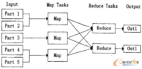 作為云計(jì)算的核心,簡單來講Map Reduce就是“任務(wù)的分解與結(jié)果的匯總”,圖3是其工作模式示意圖。