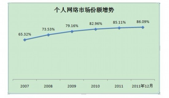 手機(jī)的增長(zhǎng)非常顯著,從2007年開始,手機(jī)用戶每年以42.7%的速度增長(zhǎng)。手機(jī)的市場(chǎng)份額從2007年的80.19%增加到2011年12月的96.47%,現(xiàn)在已經(jīng)遠(yuǎn)遠(yuǎn)超過(guò)了固話。