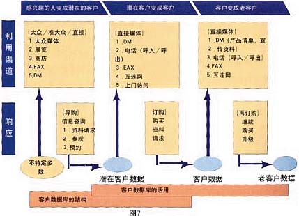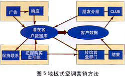 ——銷售支持:東京煤氣公司擁有三種主要的家用產(chǎn)品:地板式空調(diào),煤氣暖氣及煤氣衣服干燥機(jī)。此公司于1993年開始運(yùn)用數(shù)據(jù)庫營銷,現(xiàn)已取得了驕人的成果。其中主力產(chǎn)品——地板式空調(diào),盡管周期長、價(jià)格高,1997年一年就銷售了3萬6千套,同時(shí)從對(duì)這些用戶調(diào)查的結(jié)果發(fā)現(xiàn)“滿意”的占96%。下面介紹一下“地板式空調(diào)”的營銷方法(見圖5)