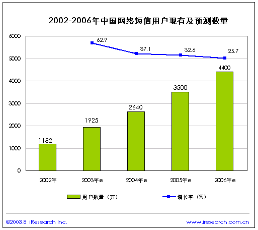 根據(jù)iResearch調(diào)查2002年網(wǎng)絡(luò)短信用戶(hù)為1182萬(wàn),占網(wǎng)民總數(shù)的20%,2003年達(dá)到1925萬(wàn),增長(zhǎng)率為62.9%,預(yù)計(jì)到2006年將達(dá)4400萬(wàn),有30%的網(wǎng)民會(huì)使用網(wǎng)絡(luò)短信,網(wǎng)絡(luò)短信市場(chǎng)將具有非常廣泛的用戶(hù)基礎(chǔ)。
