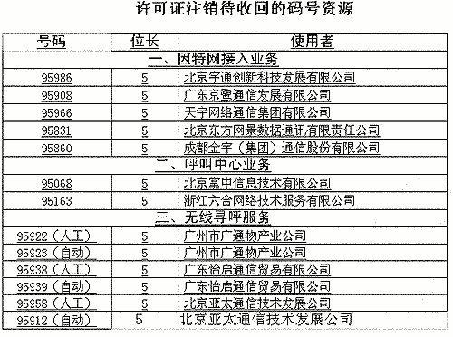 信產部公告稱,對這次經營許可證注銷涉及的13個號碼,將依據《電信網碼號資源管理辦法》(信息產業(yè)部令第28號)將予以收回。(高飛)