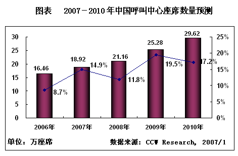 計(jì)世資訊(CCW Research)的研究成果《2006-2007年中國呼叫中心市場(chǎng)研究報(bào)告》預(yù)計(jì),2007-2010年中國呼叫中心的產(chǎn)業(yè)投入規(guī)模平均年度復(fù)合增長(zhǎng)率將超過20%,預(yù)計(jì)2007年中國呼叫中心投入規(guī)模將達(dá)到337.19億元,同比增長(zhǎng)24.8%。由于2007、2009兩個(gè)年度中國呼叫中心將開始更換新的系統(tǒng)平臺(tái),并開拓遠(yuǎn)程座席市場(chǎng),因此2007年的呼叫中心座席規(guī)模增長(zhǎng)率高于2006年,2009年的呼叫中心座席規(guī)模增長(zhǎng)率高于2008年。預(yù)計(jì)2007年中國呼叫中心座席數(shù)量將達(dá)到18.92萬個(gè),同比增長(zhǎng)14.9%;而2006年呼叫中心座席數(shù)量的同比增長(zhǎng)率僅僅是8.7%,可見2007年的增長(zhǎng)率比2006年的高出6.2個(gè)百分點(diǎn)。計(jì)世資訊(CCW Research)研究認(rèn)為,2007年成為中國呼叫中心產(chǎn)業(yè)發(fā)展的轉(zhuǎn)折點(diǎn),2007年中國開始進(jìn)入第二波呼叫中心建設(shè)高潮期。