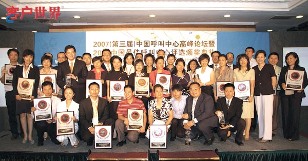 2007年9月18日,北京。[客戶世界消息]2007(第三屆)中國呼叫中心高峰論壇暨2007年中國最佳呼叫中心評(píng)選頒獎(jiǎng)典禮今天在北京舉行;本屆會(huì)議由中國電子商會(huì)呼叫中心與客戶關(guān)系管理專業(yè)委員會(huì)(CNCCA)主辦,客戶世界機(jī)構(gòu)(CCMWorld