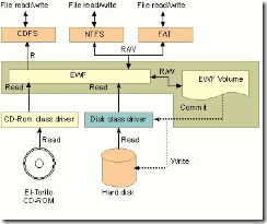 EWF能夠使操作系統(tǒng)可以從只讀媒體(如 CD ROM、寫保護(hù)硬盤或閃存)中啟動(dòng)。所有對受到 EWF保護(hù)的卷進(jìn)行的寫入都被重定向到覆蓋。這些寫入被緩存在覆蓋中并且作為卷的一部分提供。這會產(chǎn)生該卷可寫的表象。覆蓋可能存在于磁盤或隨機(jī)訪問內(nèi)存 (RAM) 中。如果需要,可以將覆蓋中存儲的數(shù)據(jù)提交給受保護(hù)的卷。