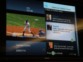 在使用電視窗件時,電視機屏幕將被分為左右兩塊,Twitter消息顯示在其中一個屏幕中。這一應(yīng)用在觀看重大事件或者體育賽事時可以帶來非常精彩的體驗。比如觀看紐約楊基隊的一場棒球比賽,用戶可以同時閱讀洋基隊有關(guān)的Twitter短消息。