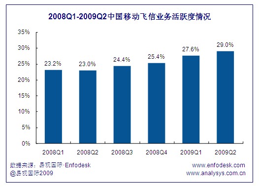 飛信用戶到達(dá)數(shù)的增長帶來了活躍用戶的穩(wěn)步提升,截止到2009年第2季度,飛信活躍用戶達(dá)到了5347萬,與2008年同期相比增長超過108.3%。由于一方面飛信到達(dá)數(shù)增長環(huán)比從2008年第2季度持續(xù)下跌,在2009年第2季度才止跌反彈,相比另一方面飛信活躍用戶的增長環(huán)比始終保持在15%以上,且從2008年第4季度開始飛信活躍用戶增幅持續(xù)擴(kuò)大,因此近期飛信業(yè)務(wù)用戶活躍度表現(xiàn)出良好的增長勢頭。