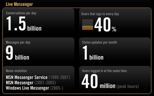 關(guān)于微軟MSN的數(shù)據(jù)為:每天產(chǎn)生的溝通次數(shù)為15億,每天產(chǎn)生的消息為90億條。每月簽名檔消息更新量為10億條。每天都登陸的用戶(hù)比例為40%,同時(shí)在線(xiàn)人數(shù)最高值為4000萬(wàn)。