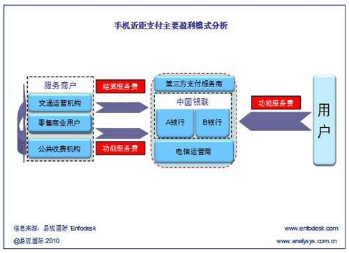 根據(jù)Enfodesk易觀智庫近期發(fā)布的《中國(guó)手機(jī)支付市場(chǎng)系列專題報(bào)告2010——近距支付》報(bào)告顯示,手機(jī)近距支付的主要盈利模式只有三種:即前向用戶服務(wù)費(fèi)、結(jié)算手續(xù)費(fèi)和后向商戶服務(wù)費(fèi)。