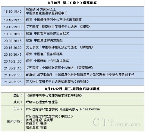 CTI論壇(ctiforum)8月3日消息(記者 潘婷婷):“第八屆中國(guó)呼叫中心產(chǎn)業(yè)高峰論壇暨第八屆中國(guó)最佳呼叫中心及最佳管理人頒獎(jiǎng)大會(huì)”定于2010年8月10日在上海國(guó)際貴都大飯店召開(kāi)。此次大會(huì)是由中國(guó)信息化推進(jìn)聯(lián)盟客戶關(guān)系管理專(zhuān)業(yè)委員會(huì)主辦,ICMI國(guó)際客戶管理學(xué)院(中國(guó)區(qū))承辦。通過(guò)本次大會(huì),與會(huì)者將獲得中國(guó)最佳呼叫中心實(shí)踐經(jīng)驗(yàn)和最佳解決方案的分享,與業(yè)界精英共話呼叫中心和客戶關(guān)系管理的未來(lái)。