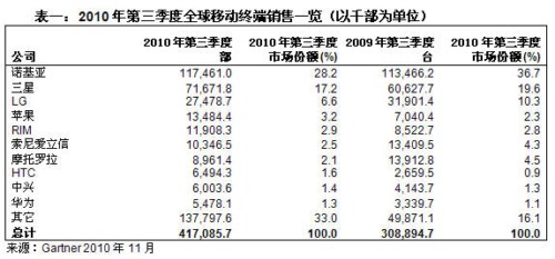 11月16日消息,Gartner指出,2010年第三季度全球手機銷售總量為4.17億部,與2009年同期相比,增長為35%。而智能手機銷售量與2009年同期相比,增長為96%,占2010年第三季度手機銷售總量的19.3%。