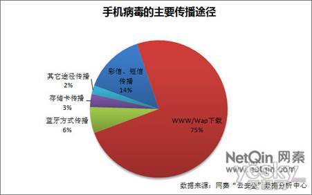 感染途徑方面,《2010年中國(guó)大陸地區(qū)手機(jī)安全報(bào)告》指出,據(jù)網(wǎng)秦“云安全”數(shù)據(jù)分析中心統(tǒng)計(jì),當(dāng)前通過(guò)手機(jī)訪問(wèn)wap和www網(wǎng)站感染病毒的比率達(dá)75%;通過(guò)短信、彩信感染病毒的比率占14%;通過(guò)藍(lán)牙傳輸方式感染病毒的比率占6%;通過(guò)存儲(chǔ)卡等途徑感染病毒的比率占3%;另外2%的用戶則是被其它傳播途徑的病毒感染。其中聯(lián)網(wǎng)感染病毒的機(jī)率最大,成為用戶面臨的最主要威脅。
