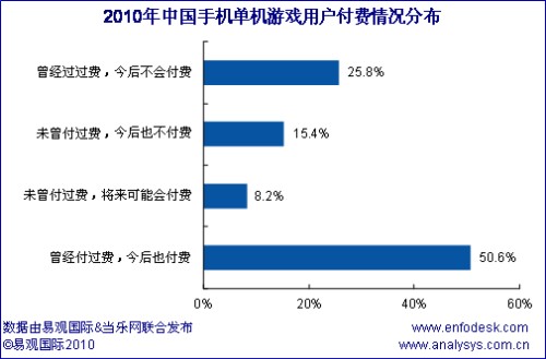 根據(jù)調(diào)研顯示,手機單機游戲中,有76.4%的用戶都有過付費經(jīng)歷,但有25.8%的用戶表示今后將不在付費,出現(xiàn)這種現(xiàn)象原因有多種,主要還是存在損害用戶行為經(jīng)常發(fā)生,外加上眾多與PC交叉用戶的涌入,而這些用戶中免費的、盜版的、破解的成為他們的首選,因此預(yù)計未來單機游戲的付費比例還將下降。