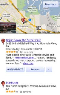 谷歌更新了移動搜索用戶界面。用戶移動設(shè)備屏幕的下方增添了諸如餐館、咖啡店、酒吧等圖標,并增添了一個“更多”的圖標。如果用戶點擊這些圖標,可以查詢用戶所在地的各種商店的信息。而且這些商店的營業(yè)場所還將會在地圖上顯示出來。