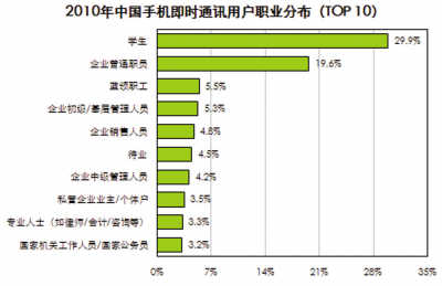 一系列研究數(shù)據(jù)足以說明些問題。研究公司艾瑞咨詢報告數(shù)據(jù)顯示,2010年中國手機上網(wǎng)用戶達到3.03億,在總網(wǎng)民數(shù)中占比約為66.3%。這其中,57.4%的用戶使用即時通訊服務(wù),位列手機上網(wǎng)用戶十大行為的第二位。