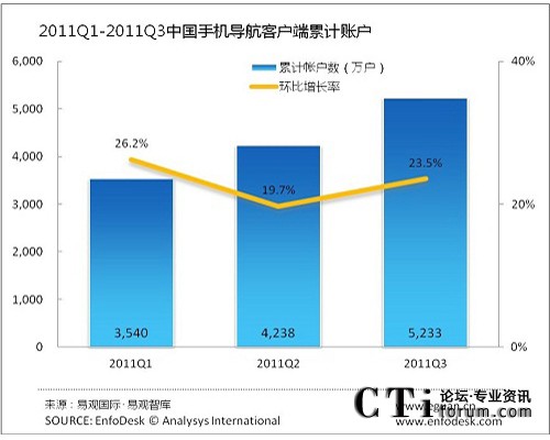 2011年3季度中國(guó)手機(jī)導(dǎo)航客戶端帳戶達(dá)5233萬