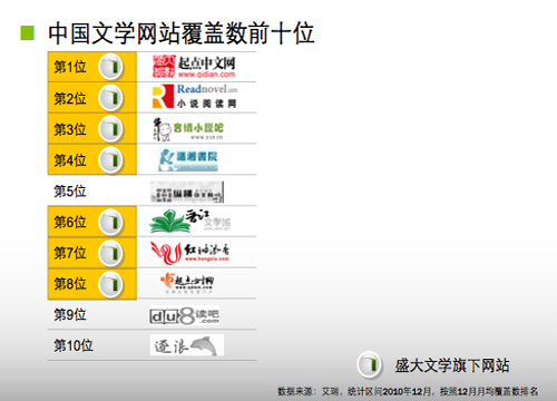 根據(jù)艾瑞咨詢的數(shù)據(jù),中國文學(xué)網(wǎng)站覆蓋人數(shù)最多的前8個(gè)文學(xué)網(wǎng)站中,盛大旗下文學(xué)網(wǎng)站占了7個(gè),包括排名第一的起點(diǎn)中文網(wǎng)等。