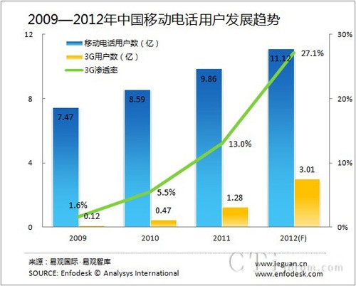 EnfoDesk易觀智庫分析認為,從手機普及程度的趨勢來看,移動電話用戶的增長將逐漸減緩,預計2012年將達11.1億。