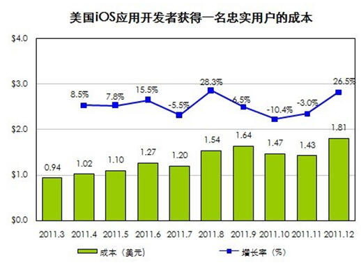 國際著名APP市場營銷組織Fiksu最新的研究數(shù)據(jù)或許能出答案。2011年12月iOS應(yīng)用開發(fā)者獲得一名忠實(shí)用戶的成本達(dá)到1.81美元,創(chuàng)下歷史新高。而在2011年第一季度,獲得一名用戶的平均成本為0.94美元,一年間單個(gè)用戶成本翻了一倍。當(dāng)用戶對(duì)蘋果商店里花樣繁多的游戲開始麻木,就需要借助有針對(duì)性的推廣策略和強(qiáng)大的執(zhí)行,讓產(chǎn)品脫穎而出。如今忠實(shí)用戶成本的提高,使得幾乎所有開發(fā)者乃至小團(tuán)隊(duì)都畏懼前期的市場推廣,大中型開發(fā)公司可利用自身的資源循環(huán)造血拉動(dòng)用戶,越是小的開發(fā)團(tuán)隊(duì)成功的幾率就越渺茫,而被吞并的可能性則大增。