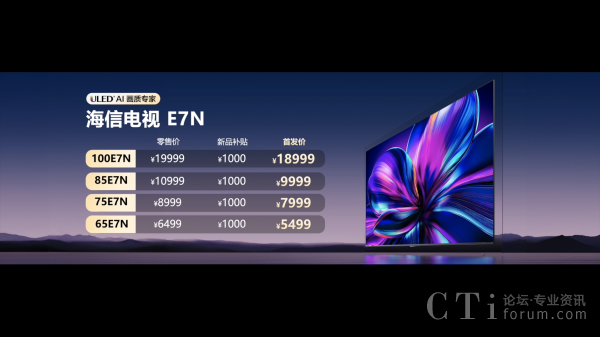 海信AI電視E7N提供了65/75/85/100吋四個(gè)版本,零售價(jià)分別是6499元、8999元、10999元、19999元,首發(fā)享受體驗(yàn)金1000元,到手價(jià)5499元、7999元、9999元、18999元,9月29日0點(diǎn)正式開(kāi)售;同時(shí)享受3000元政企雙補(bǔ)(2000元1級(jí)能效政府至高補(bǔ)貼+1000元企業(yè)至高補(bǔ)貼),以及6000元套購(gòu)補(bǔ)貼(海信品質(zhì)家電全套購(gòu),滿額至高再補(bǔ)貼6000元)。