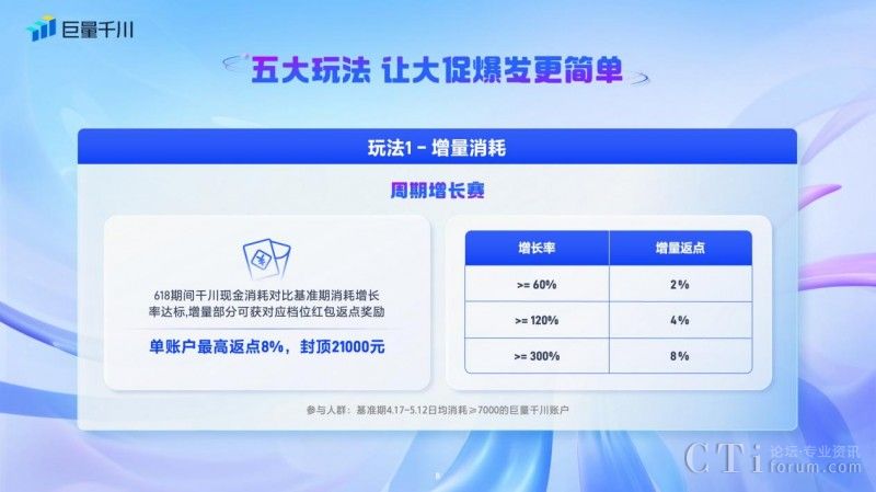 一、「周期增長賽」:針對在618好物節(jié)期間現(xiàn)金消耗對比基準期消耗增長率達標的商家,增量部分可獲得對應(yīng)檔位紅包返點獎勵,單賬戶最高返點8%,封頂21000元。