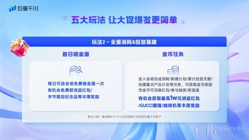 二、「每日砸金蛋&金幣任務(wù)」:針對在618好物節(jié)期間現(xiàn)金消耗對比基準期消耗增長率未達標的商家,可參與每日砸金蛋和金幣任務(wù)。商家每日可進入會場免費砸金蛋一次,就有機會免費獲得消返紅包和字節(jié)限定紀念品等獎勵。此外,商家進入會場完成消耗/新建計劃/累計投放天數(shù)/創(chuàng)建重點產(chǎn)品計劃等任務(wù),可獲取金幣獎勵,憑金幣可兌換紅包、參與抽獎和拆盲盒等豐厚獎勵,最高可得10000元消返紅包。
