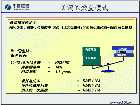 華夏證券經(jīng)紀(jì)業(yè)務(wù)總部的姚磊作為唯一的成功應(yīng)用案例代表,主要是和與會的金融機構(gòu)分享在客戶關(guān)系管理規(guī)劃方面的一些成功經(jīng)驗。華夏證券認(rèn)為,對于證券公司的經(jīng)紀(jì)業(yè)務(wù)來講,客戶關(guān)系管理的主要目標(biāo)應(yīng)該是把客戶關(guān)系管理系統(tǒng)的核心功能融入開戶、交易、服務(wù)、咨詢等四個與客戶互動的過程之中,比如:客戶資料規(guī)戶整合形成統(tǒng)一的客戶號,管理客戶交易偏好和產(chǎn)品偏好上的變化,配合多種渠道建立一對一銷售流程,客戶終身價值管理。在風(fēng)險控制方面,華夏證券同樣貢獻(xiàn)了寶貴的經(jīng)驗,在這方面他們認(rèn)為最重要的方面是要做好高層領(lǐng)導(dǎo)的灌輸和培訓(xùn)工作,讓企業(yè)的高層領(lǐng)導(dǎo)對于客戶關(guān)系管理有一個正確的理解,從而對于項目的投資有一個合理的預(yù)期和實證,通俗一點說,就是首先為整個項目找一個合適的發(fā)起人。第二點要注意,要有專業(yè)的項目管理隊伍,這其實就是集成商選擇方面的風(fēng)險。除此之外,還要對項目要有一個明確的定義,關(guān)注每一步提交的結(jié)果,在項目過程中就隨時發(fā)現(xiàn)問題、解決問題。