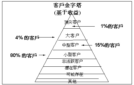 將數(shù)據(jù)以圖象化形式輸出,易于向你展示正在發(fā)生何事。簡單如一個(gè)金字塔,其頂部(百分之一)表示盈利最高的頂尖客戶,下一層為大客戶(百分之四),然后是中型(百分之十五)和小客戶(百分之八十),最后是不活躍的、潛在的、可能存在的客戶及其它各種等等。