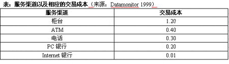 表:服務(wù)渠道以及相應(yīng)的交易成本(來(lái)源:Datamonitor 1999)