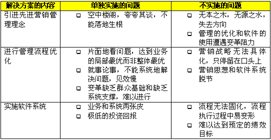 在CRM出現(xiàn)以前,企業(yè)為了解決市場(chǎng)、銷售和服務(wù)方面的問(wèn)題,更好地吸引、獲得、保留和發(fā)展客戶,采取了各種方式,比如使用一套分銷管理的解決方案,或者請(qǐng)"點(diǎn)子公司"出謀劃策,或者尋求某個(gè)具體業(yè)務(wù)的優(yōu)化。以上這些做法往往只能完成局部的改進(jìn),或取得短期的效果,無(wú)法形成長(zhǎng)期和整體的競(jìng)爭(zhēng)優(yōu)勢(shì)。原因就在于這些解決方案都只提供了片面的、局部的解決方案,"頭痛醫(yī)頭,腳痛醫(yī)腳"不能綜合管理理念、業(yè)務(wù)流程和技術(shù)應(yīng)用這三個(gè)方面,系統(tǒng)地分析和解決問(wèn)題。下表中分析了這些解決方案單獨(dú)實(shí)施或者不實(shí)施會(huì)帶來(lái)什么問(wèn)題。