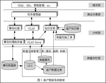 圖1描述了一個典型的客戶智能系統(tǒng)體系結構。面向特定的應用,客戶智能的體系結構會有所改進,以使系統(tǒng)與具體的業(yè)務相符。例如:建立何種數據存貯和數據模型能很好地支持主題,支持客戶數據分析和客戶知識發(fā)現的需要;選擇何種決策分析工具;將發(fā)現的客戶知識通過何種接口傳送給相應的用戶等等,都需要實際情況結合起來考慮。