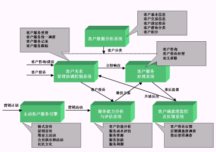 目的是保證和提高客戶服務(wù)的工作效率與質(zhì)量水平。例如,當客戶滿意度監(jiān)測與反饋系統(tǒng)將客戶信息反饋給協(xié)調(diào)控制系統(tǒng)后,后者立刻要求客戶盈利能力評估系統(tǒng)進行評估,并提出最佳方案,然后向客戶服務(wù)處理系統(tǒng)發(fā)出指令,由它進行實施。