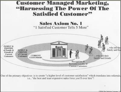 客戶滿意的影響范圍如下圖所示,客戶滿意的力量從里向外逐層波及,以現(xiàn)有客戶的滿意為基礎,然后通過推薦傳遞到新的客戶。其傳遞路徑為“現(xiàn)有客戶”——“現(xiàn)有客戶的家人及朋友”——“現(xiàn)有客戶的家人及朋友的家人及朋友”…一直延伸下去最終使企業(yè)的營銷策略大獲成功,這一切的動力都來自于“更高的客戶滿意度引起的客戶行為”。這個營銷公式要取得長期成功沒有任何秘密,它失敗的風險被最小化,因為它依靠的是客戶積極的行動和表現(xiàn),以久經(jīng)考驗的銷售公理——“1個滿意的客戶會把自己的愉快經(jīng)歷告訴5個以上的人!薄獮榛A。