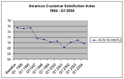 再看美國客戶滿意度指數(shù)(ACSI)的統(tǒng)計,顯示客戶滿意度正在逐步下跌,考慮到這一點,很明顯可以看出人們正越來越脫離客戶的本質。