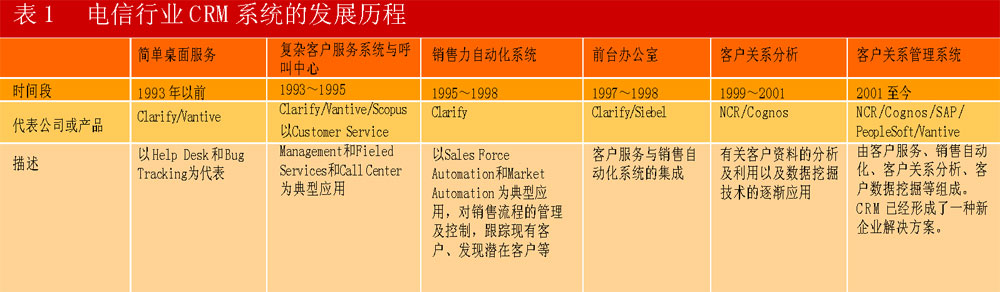 表1 電信行業(yè)CRM系統(tǒng)的發(fā)展歷程