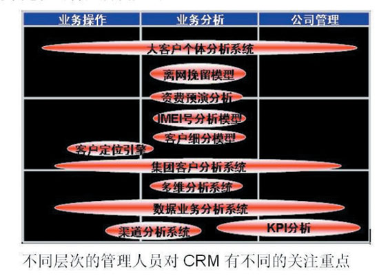 同理,面向大客戶和集團(tuán)客戶工作的大客戶個(gè)體分析系統(tǒng)和集團(tuán)客戶分析系統(tǒng)因?yàn)槠涿嫦蛞粋(gè)部門的特殊性,所以橫跨了業(yè)務(wù)操作、業(yè)務(wù)分析和管理三個(gè)層次。只有將CRM系統(tǒng)的建設(shè)按照模塊化結(jié)構(gòu)化的思路進(jìn)行才能真正滿足用戶的實(shí)際需求和其日常工作與業(yè)務(wù)緊密聯(lián)系起來(lái),使CRM系統(tǒng)發(fā)揮出應(yīng)有的效果。