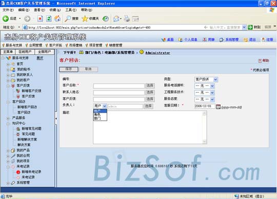 頁面的最頂端將本系統(tǒng)分為服務(wù)與支持、合同管理、客戶開拓、市場營銷、項目管理、銷售管理六板塊進(jìn)行陳列以方便管理,同時左側(cè)是詳細(xì)的樹形結(jié)構(gòu)圖,所有功能一目了然。本系統(tǒng)實現(xiàn)了將不同業(yè)務(wù)、客服人員涉及的客戶資料進(jìn)行了全面而且條理的整理匯集,整合團(tuán)隊的力量提供完善的服務(wù)。