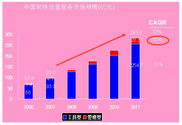 計世資訊(CCW Research)認為,軟件運營服務(wù)可以分為兩大類,即工具型軟件運營服務(wù)與管理型軟件運營服務(wù)。工具型軟件運營服務(wù)是指面向個人或組織的、但不會涉及要建立自己數(shù)據(jù)庫的軟件運營服務(wù),主要包括在線翻譯服務(wù)、在線殺毒服務(wù)、在線教育服務(wù)、網(wǎng)絡(luò)游戲服務(wù)、網(wǎng)絡(luò)視頻服務(wù)、網(wǎng)絡(luò)搜索服務(wù)、在線辦公軟件服務(wù)等。管理型軟件運營服務(wù)是指面向組織的、和經(jīng)營管理相關(guān)的,并且需要建立自己數(shù)據(jù)庫的軟件運營服務(wù),主要包括管理軟件的運營服務(wù),例如在線CRM服務(wù)、在線進銷存服務(wù)、在線HR服務(wù)、在線ERP服務(wù)等。從目前來看,工具型軟件運營服務(wù)較為常見,也較為成熟;而管理型軟件運營服務(wù)則較為復(fù)雜,目前國內(nèi)市場剛剛處于起步階段。