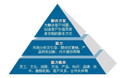 解決方案導(dǎo)向型企業(yè)在整個(gè)經(jīng)營(yíng)過程中積極倡導(dǎo)上述觀念,并在向客戶的服務(wù)過程中身體力行,這需要企業(yè)具備哪些核心的能力,這些能力又該如何獲取呢?看看下圖中的解決方案型企業(yè)能力金字塔: