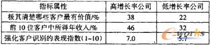 對(duì)《財(cái)富》雜志排名前l(fā)000位公司的200位經(jīng)理調(diào)查后得出結(jié)論,企業(yè)增長(zhǎng)性與清楚的識(shí)別客戶有明顯的聯(lián)系(見(jiàn)表1)。該表反映了高增長(zhǎng)率的企業(yè)比低增長(zhǎng)率的企業(yè)更加懂得客戶識(shí)別的重要性,并運(yùn)用技巧來(lái)強(qiáng)化核心客戶為企業(yè)創(chuàng)造更多價(jià)值。