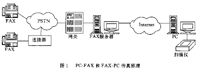 傳真機(jī)的基本工作原理是利用光電掃描技術(shù)將圖像、文字轉(zhuǎn)化為采用霍夫曼編碼方式的數(shù)字信號(hào),經(jīng)V.27、V.29方式調(diào)制后,按T.30協(xié)議在模擬信道上傳輸。由于通信協(xié)議、信號(hào)格式的不同,傳真機(jī)是不能直接在Internet網(wǎng)上傳送信息的。要使連接在PSTN上的傳真機(jī)發(fā)出的信號(hào)在Internet網(wǎng)上傳輸,基本的原理則是在PSTN和Internet之間構(gòu)筑網(wǎng)關(guān),由網(wǎng)關(guān)進(jìn)行協(xié)議的轉(zhuǎn)換,使PSTN網(wǎng)的傳真信號(hào)和Internet網(wǎng)的數(shù)據(jù)包可以相互轉(zhuǎn)換。