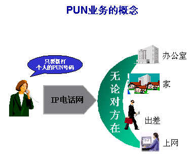 PUN業(yè)務(wù)首先給注冊用戶分配一個號碼,此號碼根據(jù)運營商所申請到的網(wǎng)號及用戶規(guī)模來規(guī)劃,如181XXXXXXX,申請到該號碼后,用戶可以通過各種方便的方式(如上網(wǎng)、打電話)等將此號碼綁定到任一特定終端,如家庭電話,移動手機等,綁定以后,任何人在任何地點都可以通過拔打此號碼,PUN系統(tǒng)將會根據(jù)用戶的設(shè)置,將此呼叫經(jīng)IP網(wǎng)絡(luò)送至對應(yīng)的終端,從而完成呼叫,PUN用戶還可以設(shè)置繁雜的規(guī)劃,如當手機關(guān)機時,將呼叫送至某一固定電話,或在用戶上網(wǎng)時,首選PC機作為呼叫終端,也可以根據(jù)時間段來靈活設(shè)置終端,其設(shè)置方法也比傳統(tǒng)的呼叫轉(zhuǎn)移更加方便和靈活。其圖一: