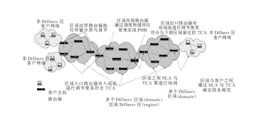 區(qū)分服務(wù)是由綜合服務(wù)(Int-serv )發(fā)展而來(lái)的,它采用了IETF的基于RSVP的服務(wù)分類(lèi)標(biāo)準(zhǔn),拋棄了分組流沿路節(jié)點(diǎn)上的資源預(yù)留。區(qū)分服務(wù)將會(huì)有效地取代跨越大范圍的RSVP的使用。區(qū)分服務(wù)區(qū)域的主要成員有:核心路由器、邊緣路由器、資源控制器(BB,Bandwidth Broker)。在區(qū)分服務(wù)中,網(wǎng)絡(luò)的邊緣設(shè)備對(duì)每個(gè)分組進(jìn)行分類(lèi)、標(biāo)記DS域,用DS域來(lái)攜帶IP分組對(duì)服務(wù)的需求信息。在網(wǎng)絡(luò)的核心節(jié)點(diǎn)上,路由器根據(jù)分組頭上的DS碼點(diǎn)(Code Point)選擇碼點(diǎn)所對(duì)應(yīng)的轉(zhuǎn)發(fā)處理。資源控制器BB配置了管理規(guī)則,為客戶(hù)分配資源,它可以通過(guò)服務(wù)級(jí)別協(xié)定SLA (Service Level Agreement)與客戶(hù)進(jìn)行相互協(xié)調(diào)以分享規(guī)定的帶寬。