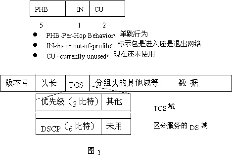 QoS的業(yè)務(wù)區(qū)分結(jié)構(gòu)使用IPV4報(bào)頭中的業(yè)務(wù)類(lèi)型(TOS)字段,并將8位TOS字段重新命名,作為DS字段,其中6位可供目前使用,其余2位以備將來(lái)使用。該字段可以按照預(yù)先確定好的規(guī)則加以定義,使下行節(jié)點(diǎn)通過(guò)識(shí)別這個(gè)字段,獲取足夠的信息來(lái)處理到達(dá)輸入端口的數(shù)據(jù)包并將他們正確地轉(zhuǎn)發(fā)給下一跳的路由器。這里需要注意的是在IPV4網(wǎng)中所定義的TOS字段與在Diff-Serv中的DS字段不同。TOS字段的定義如圖2所示。圖IPV4報(bào)頭中TOS字段定義Diff-Serv充分考慮了IP網(wǎng)絡(luò)本身靈活,可擴(kuò)展性強(qiáng)的特點(diǎn),將復(fù)雜的服務(wù)質(zhì)量保證通過(guò)DS字段轉(zhuǎn)換為先進(jìn)的單跳行為,從而大大減少了信令的工作。