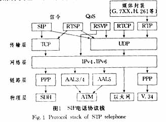 SIP不是垂直型通信系統(tǒng),不能獨(dú)立提供業(yè)務(wù),它必須與其它協(xié)議共同使用來構(gòu)建一個(gè)完整的多媒體體系結(jié)構(gòu),所以在構(gòu)建下一代網(wǎng)絡(luò)的多媒體體系時(shí),采用以下的協(xié)議組合提供多媒體業(yè)務(wù)。基于SIP的電話協(xié)議棧如圖1所示。圖1中,①網(wǎng)絡(luò)層:使用IPv4或IPv6(建議IPv6);②傳輸層:使用TCP或UDP(建議UDP);③應(yīng)用層:包括以SIP為核心的多個(gè)協(xié)議。