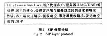 SIP本身是一種分層協(xié)議,如圖2所示。由此可見,SIP采用C/S結(jié)構(gòu),通過MESSAGE機(jī)制來建立會(huì)話。因?yàn)镾IP處理的是客戶端與服務(wù)器之間的請求和響應(yīng),所以SIP消息包括了請求消息和響應(yīng)消息。二者都具有相同的消息格式: