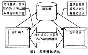 通過設(shè)置一個信令服務(wù)器的方式綜合以上兩種方式的優(yōu)缺點。用戶通話程序工作于半客戶機狀態(tài),信令服務(wù)器負責(zé)客戶的集中呼叫。當(dāng)某一個客戶呼叫,服務(wù)器負責(zé)中轉(zhuǎn)呼叫,當(dāng)被叫客戶響應(yīng)呼叫并應(yīng)答后,自主于呼叫方進行通話而不必經(jīng)過信令服務(wù)器,這樣,大幅度地減少了服務(wù)器的數(shù)據(jù)量。有了集中的信令服務(wù)器,也便于客戶的管理,還可進行廣播消息的發(fā)布。
