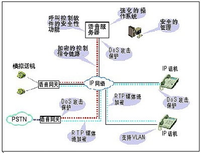 IP電話的各個組成部分從語音服務(wù)器、語音網(wǎng)關(guān)到IP電話都能夠?qū)oS攻擊具有相應(yīng)的保護功能: