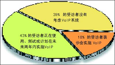 該調(diào)查收集了全球254名高級管理人員對未來企業(yè)網(wǎng)絡(luò)的意見和看法。其中,43%的受訪者表示,他們正在使用、測試或計劃在未來兩年內(nèi)實施VoIP;另外 18% 的受訪者表示,從長遠(yuǎn)的角度來講,他們會實施 VoIP。市場預(yù)測也顯示相同的樂觀前景。研究機(jī)構(gòu)Gartner Dataquest預(yù)期到2008年,公用電話交換網(wǎng) (PSTN) 的零售語音收入將輕微下跌,而VoIP的零售收入則上升 38.6%。